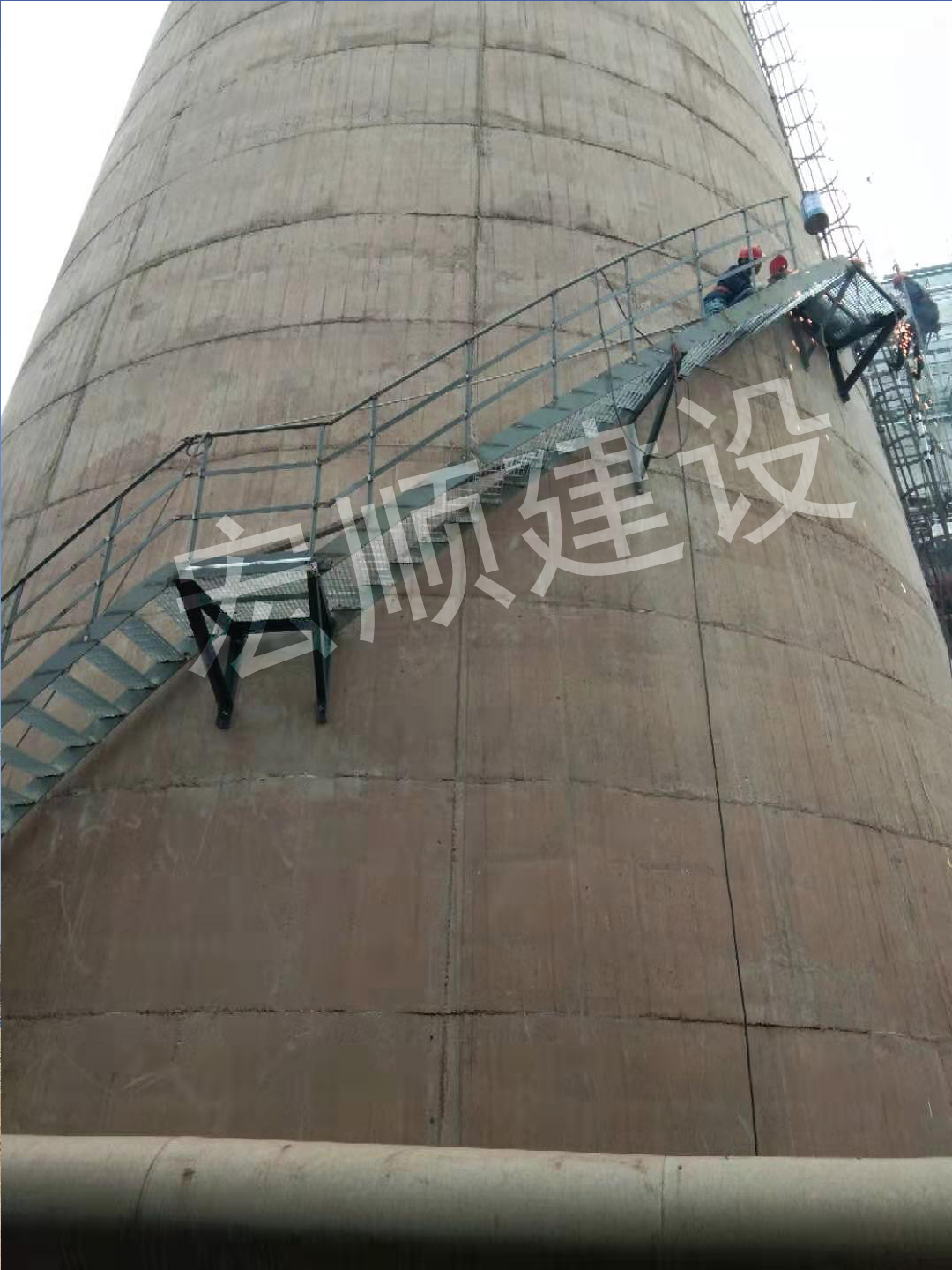 對120米煙囪身從下向上依次焊接安裝,將第一塊踏步板焊接在囪身后,就依第一塊板為作業平臺依次向上逐步焊接安裝。同時準備兩臺焊機,一臺焊接負責焊接安裝踏步板,另一臺負責焊接欄桿及加固用。在焊接安裝平臺時,先將平臺三角支撐焊接固定在囪身,后再鋪焊平臺板。對踏步板、平臺及欄桿等焊接處進行油漆防腐。