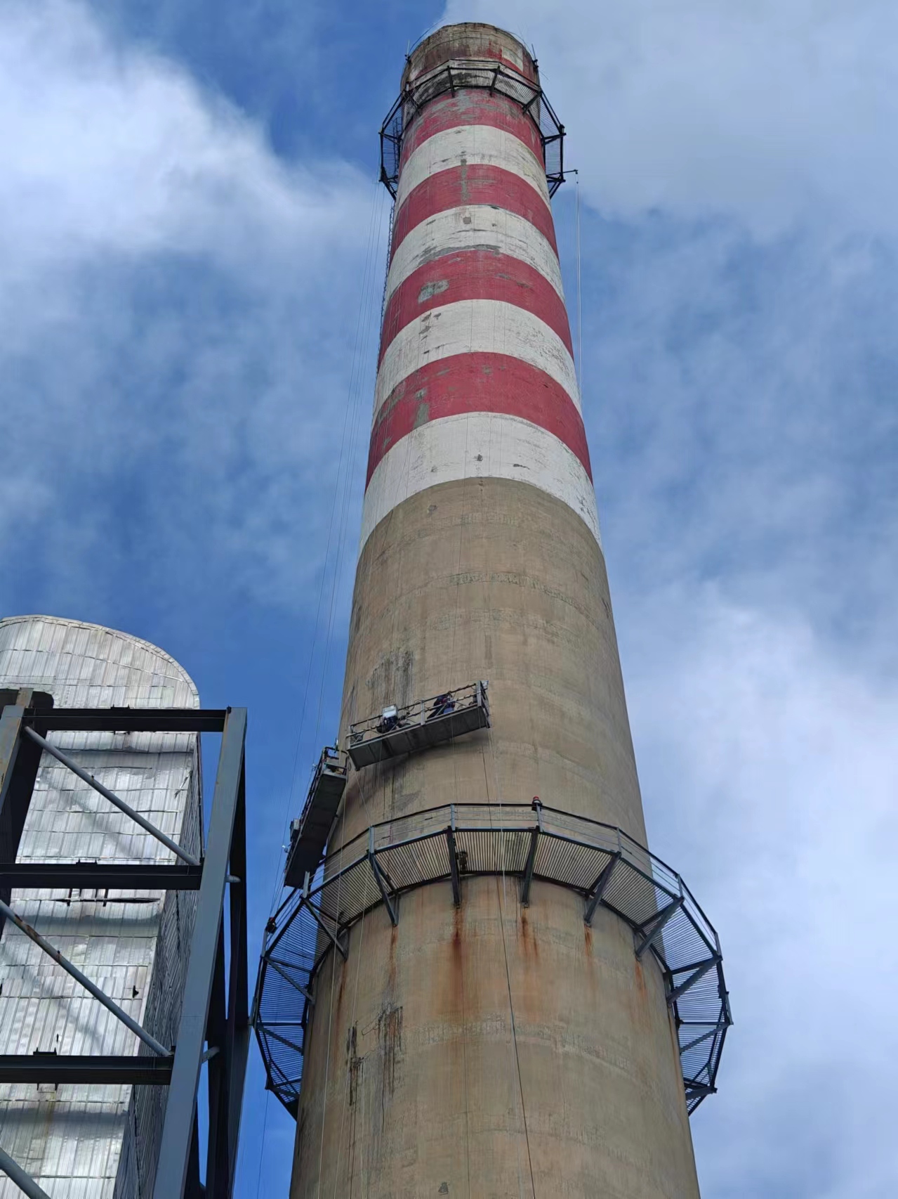 華錦熱電水泥煙囪外壁堵漏維修施工中